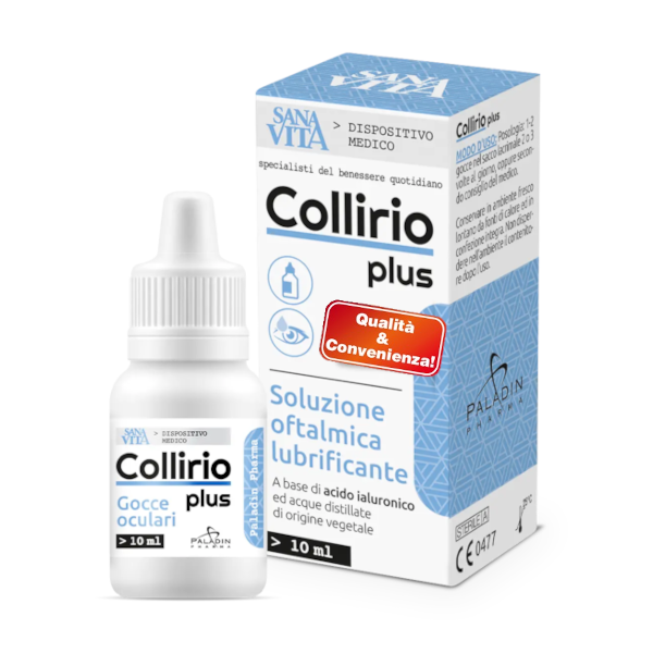 Sanavita Collirio plus sterilus izotoninis tirpalas, kurio sudėtyje yra hialurono (0,4%), hamamelio, dedešvų ir ramunėlių distiliuoto vandens (hidrolatų).